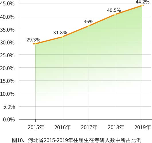 河北省2015年往届生所占比例为29.3%,到2019年这个比例升至44.2%: