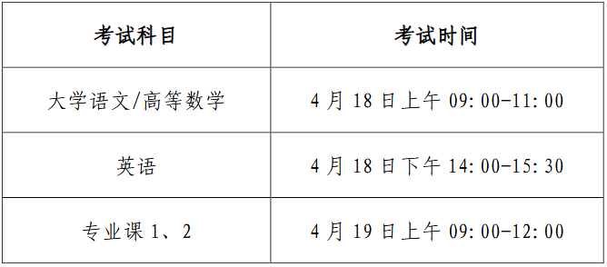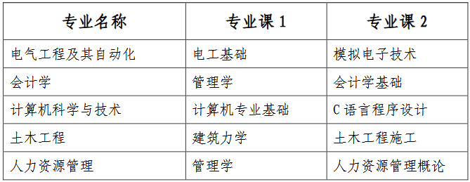 考试科目分公共课和专业课两部分。实行“2 门公共课(各 150分)+2 门专业课(各 150 分)”的方式,即公共课考试科目分文、理两个科类,其中,文科 2 门公共课为“大学语文+英语”,理科2 门公共课为“高等数学+英语”;2 门专业课为高职(专科)阶段专业课程。