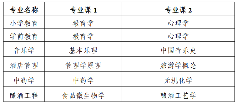 考试科目分省考试院组织的公共课和我校组织的专业课两部分。实行“2 门公共课(各 150 分)+2 门专业课(各 150分)”的方式,即公共课考试科目分文、理两个科类,其中,文科 2 门公共课为“大学语文+英语”,理科 2 门公共课为“高等数学+英语”;2 门专业课为高职(专科)阶段专业课程。公共课由省考试院组织进行统考。专业课由我校组织考试。
